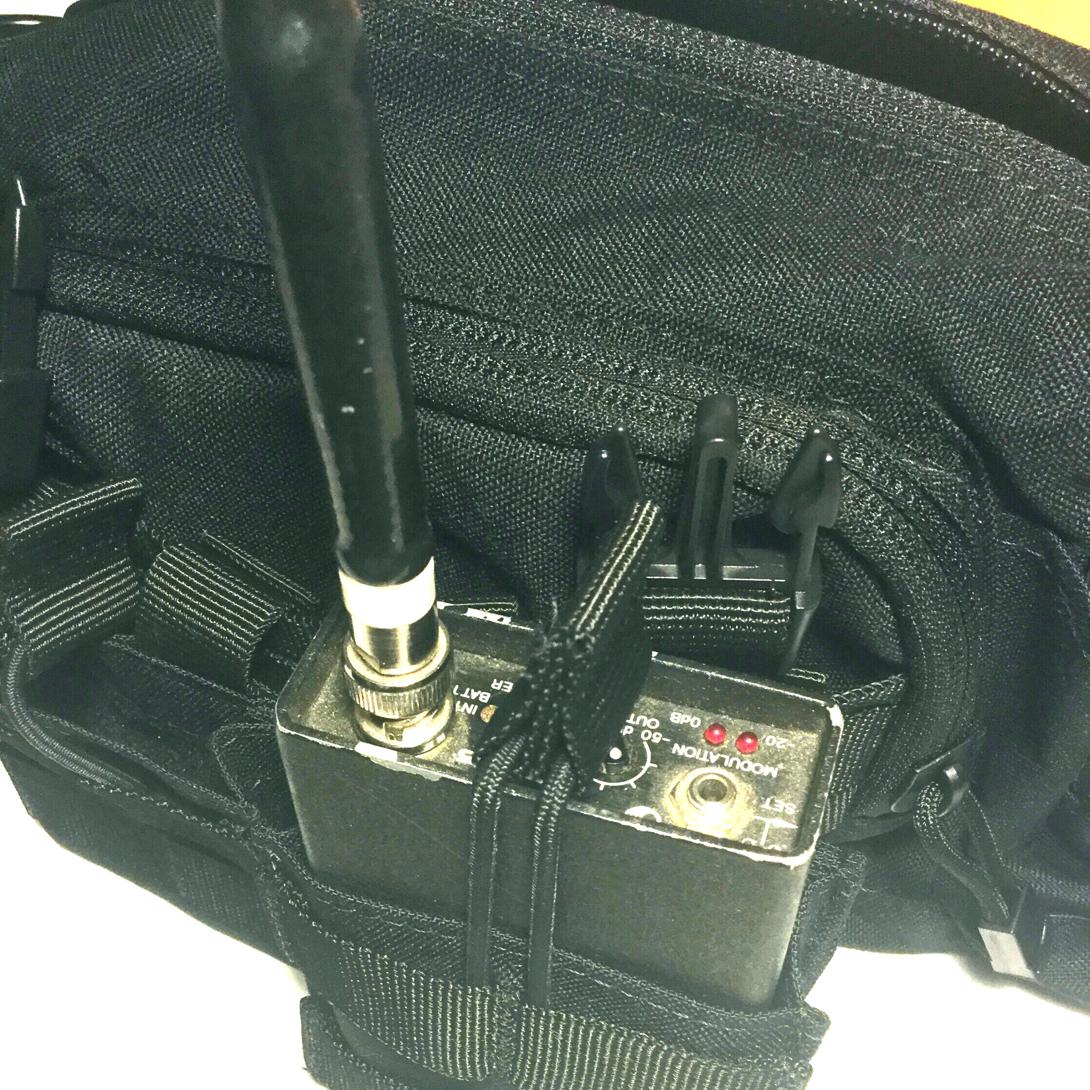 I left the top zipper alone (makes it cramped to get a recorder in and out, but it works) and left off the mag cases. Omni lavs clip to the loops on either side of the front pocket and feed into either side. A recorder (Zoom F8 in my case) and battery (Talentcell – see Andrew’s excellent mod tutorial here on Wav Report) finish out the equipment list.