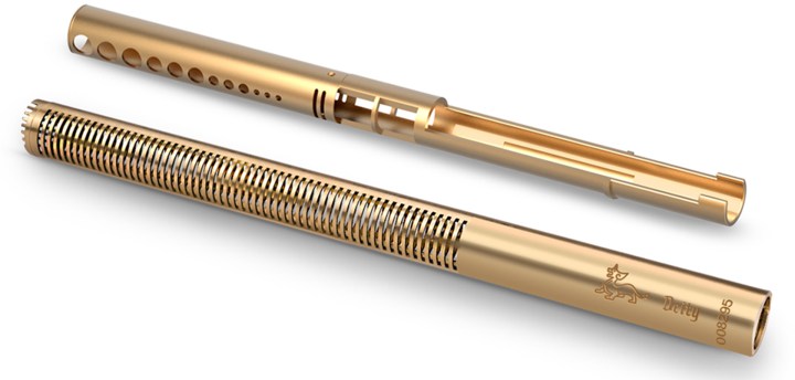 The microphone has been milled from two solid blocks of brass. Because of it is completely covered in brass, the Deity blocks a lot of RF interference.