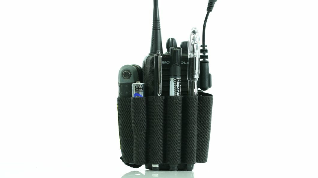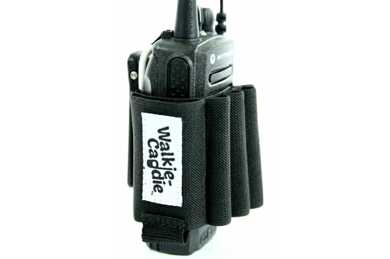 This might be the most exciting thing to happen to elastic bands since underwear. On its face the Walkie Caddie is 2 bands of elastic that have been sewn together to make loops… But it’s so much more then that.