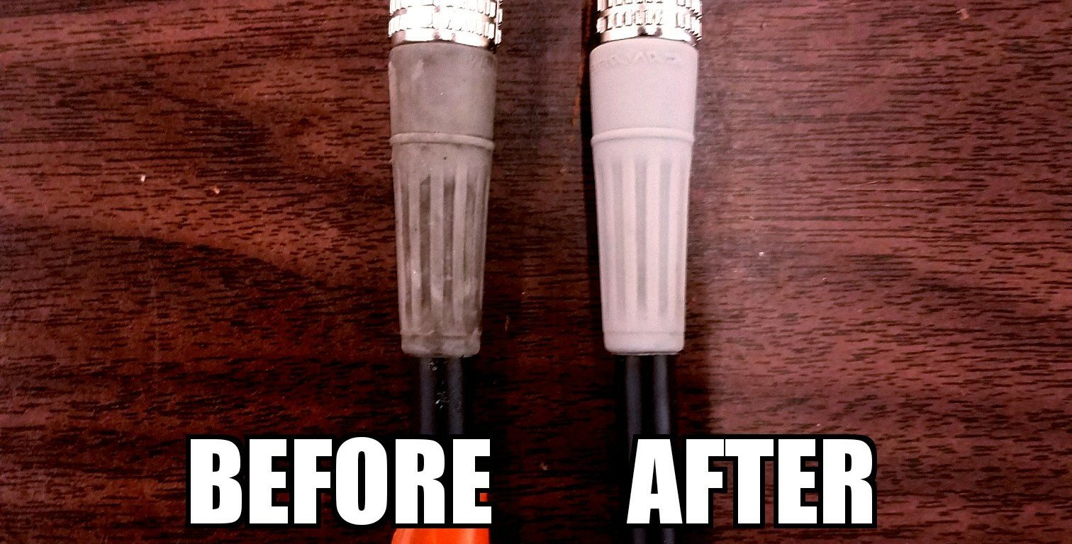 Goo Gone can also be used to clean up the rubber boots of your cables. Here is a before and after photo of a Coax cable that has been scrubbed on by just a little Goo Gone and a cotton T-shirt rag.