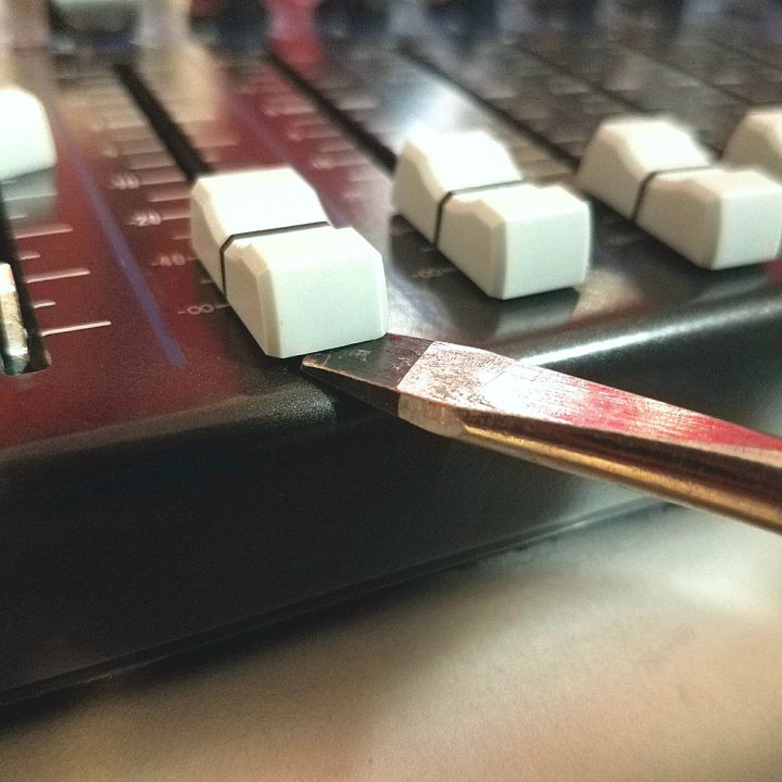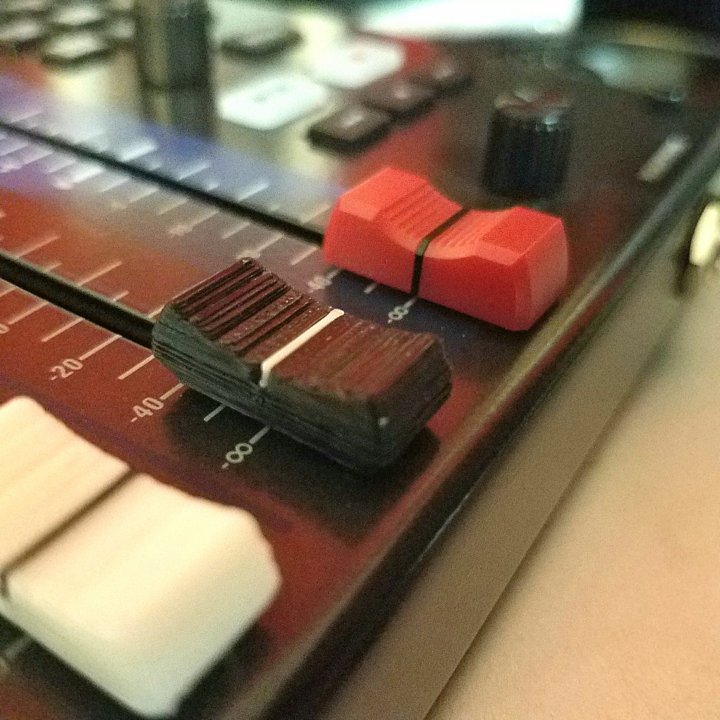 If you aren’t familiar with 3D printed projects these faders may look rough… but honestly, they look on par with ever 3D printed object I’ve ever seen. You can smooth out 3D printers with what’s called an Acidtone bath, but given that these are meant to fit snuggly on my faders, I wouldn’t want to do anything that may cause the fader hole to expand and make them loose. Also in later photos you’ll see how that rough surface will come in handy.
